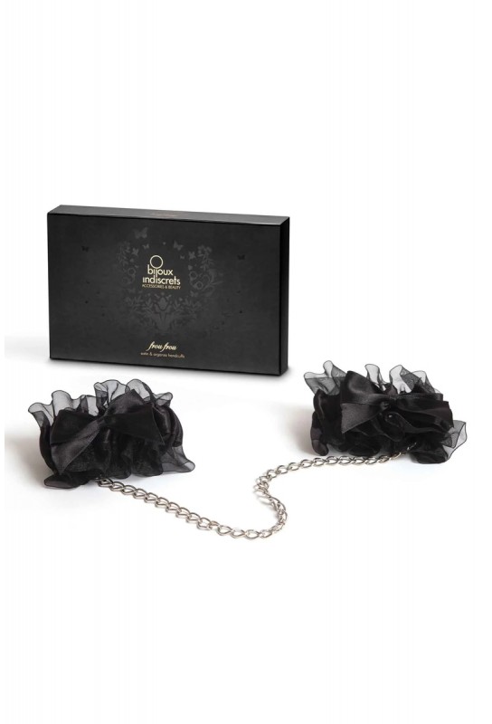 Une paire de menottes SM fantaisie présentée dans un joli coffret. Les poignets d'organdi sont froncés sur un élastique qui permet de mettre et enlever facilement ces délicieux bracelets. Un petit noeud satin pour le raffinement, une chaîne chromée à larges maillons pour attache, elle est soumise, abandonnée, en toute volupté.