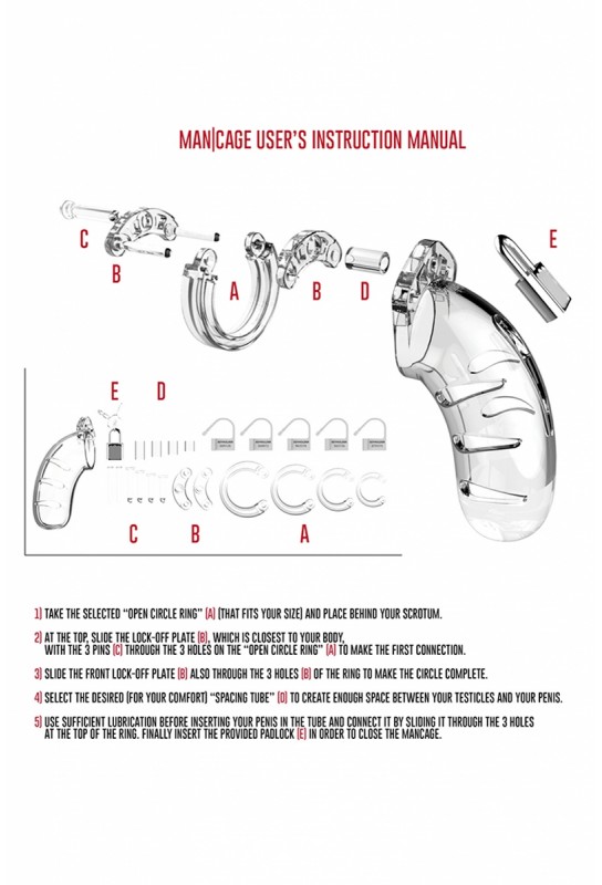 Accessoire de contrainte par excellence, la cage peut se verrouiller à l'aide d'un cadenas en métal (1 fourni) ou d'un cadenas en plastique jetable (5 fournis). L'utilisation de cadenas en plastique vous garantit de ne pas déclencher l'alarme des détecteurs de métaux lorsque vous passez sous un portique de sécurité dans un aéroport par exemple.