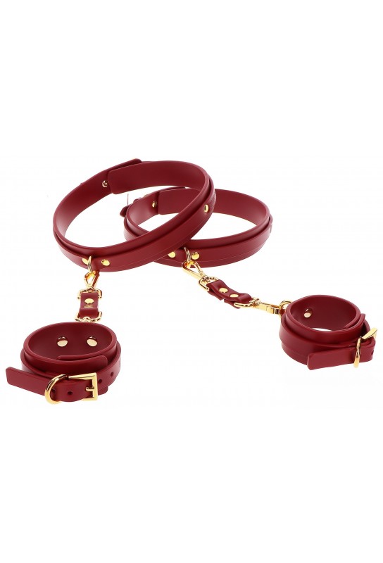 BDSM Pleasure est ravi de présenter ces attaches pensées pour sublimer vos jeux de bondage avec style. Idéales pour lier les poignets et les cuisses, elles offrent un maintien élégant tout en laissant place à l’imagination. L’ensemble se compose d’une attache pour les cuisses au tour ajustable de 44 à 62 cm et de menottes pour poignets au tour ajustable de 20 à 25 cm, pour un ajustement précis. Confectionnées en polyuréthane et rehaussées d’un contraste en métal doré, ces attaches signent une allure chic et glamour qui attire le regard et intensifie l’instant.