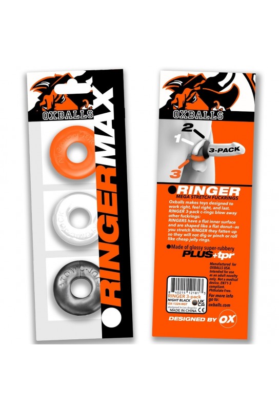 BDSM Pleasure est ravi de présenter le Lot de 3 Cockrings Ringer Max, un ensemble séduisant alliant élégance et fonctionnalité. Disponibles en trois teintes captivantes – blanc, orange et gris – ces cockrings sont conçus pour stimuler et intensifier chaque moment de plaisir.