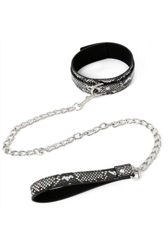 BDSM Pleasure est ravi de présenter ce collier-laisse au style chic, habillé d’une surface effet peau de serpent rehaussée de reflets argentés. Avec sa largeur de 4 cm, il affirme une présence élégante autour du cou, tout en s’ajustant précisément grâce à un tour de cou réglable de 31 à 42 cm. Sa laisse en métal de 1 mètre prolonge le geste avec une sensation froide et assumée, parfaite pour sublimer les jeux de contrôle et de complicité. Confectionné en simili (polyuréthane), cet accessoire BDSM glamour devient une pièce signature pour celles et ceux qui aiment conjuguer esthétique et intensité.