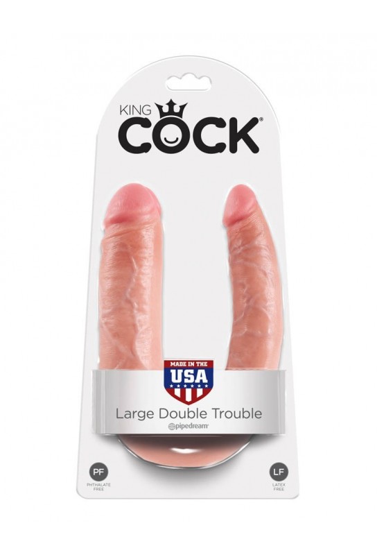 BDSM Pleasure est ravi de présenter le double gode King Cock, connu sous le nom de U-Shape Trouble, dans sa version la plus imposante. Conçu pour les amateurs de sensations intenses, il dispose de deux godes d'une longueur insérable de 17.8 cm, avec un diamètre de 3.3 cm et 4.3 cm respectivement.
