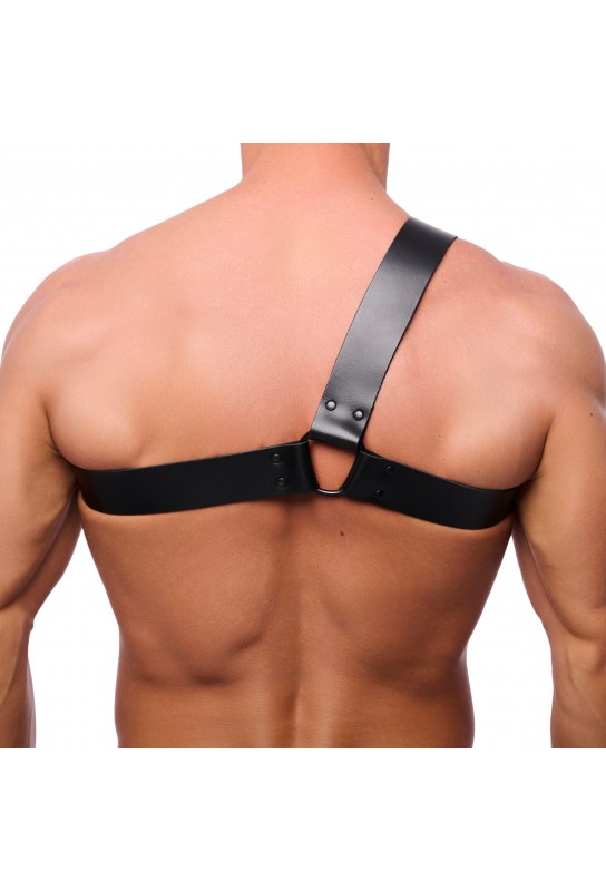BDSM Pleasure est ravi de présenter un harnais en cuir noir au design audacieux, conçu pour ceux qui recherchent l'élégance et la sensualité. Avec une unique sangle sur l'épaule, ce harnais s'ajuste parfaitement grâce à sa fermeture en métal, offrant à la fois confort et style.