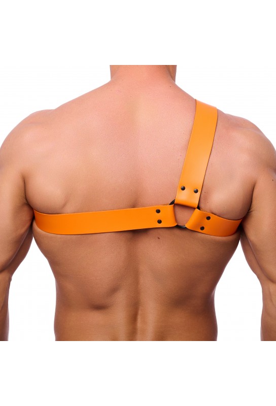 Avec sa teinte orange vibrante et ses attaches en métal noir, ce harnais se distingue par son style audacieux et glamour. Sa largeur de 4 cm et son épaisseur de 2 mm en font un accessoire à la fois robuste et séduisant, fabriqué en cuir véritable de vache avec un tannage végétal respectueux de l'environnement.