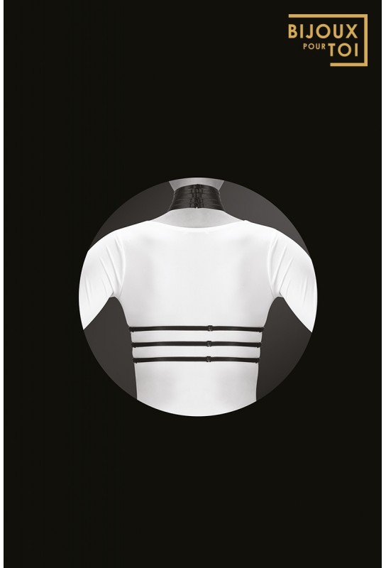 Le harnais de buste Julia et son tour de cou sont composés de lanières douces et élastiques noires. Chacune des deux pièces peut se porter séparément. Le harnais galbe votre poitrine et s'ajuste facilement dans le dos grâce à ses attaches coulissantes. Le tour de cou est également réglable.