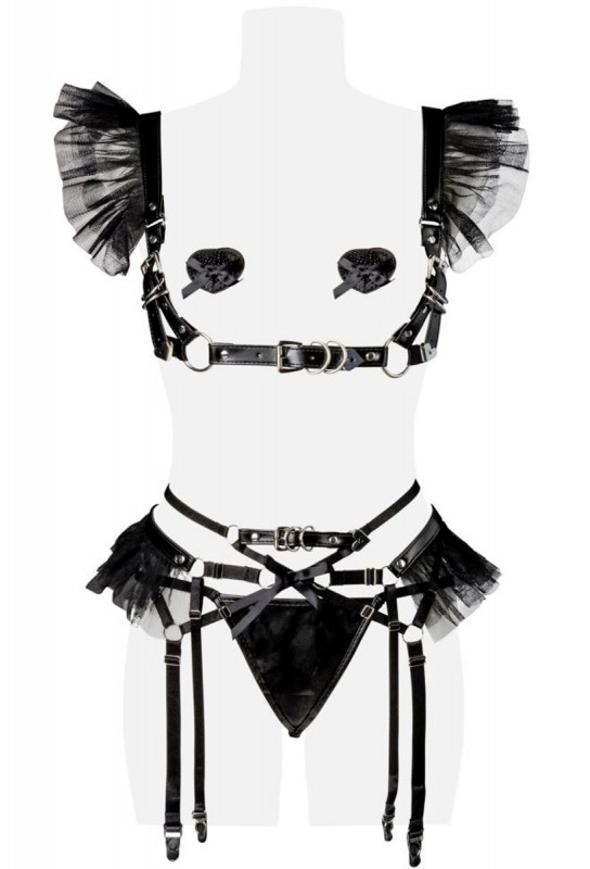 4 pièces : 1 top harnais, 1 paire de cache-tétons, 1 string, 1 porte-jarretelles harnais
