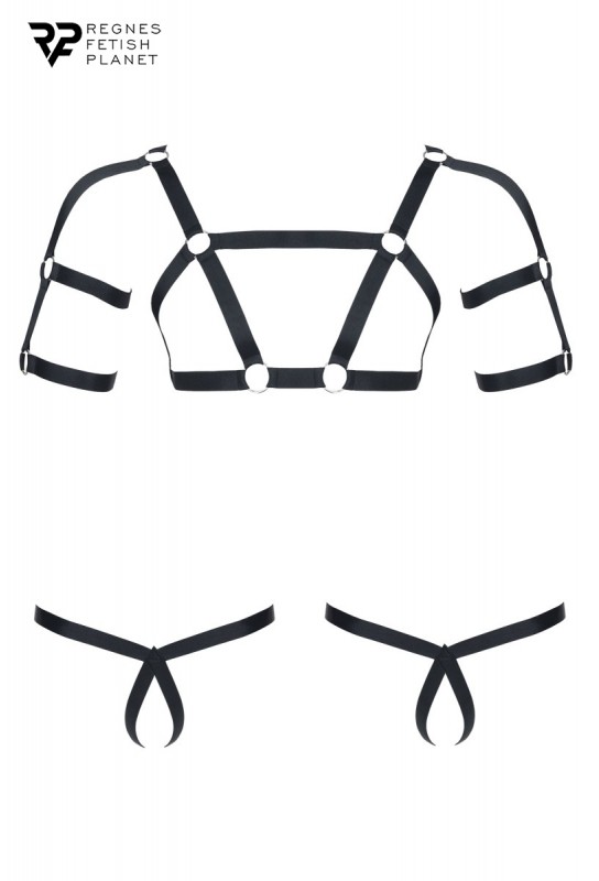 Superbe ensemble BDSM pour homme en tissu élastique noir. Les différentes lanières sont faites pour mettre les pectoraux et biceps en valeur pour la partie haute. En bas, deux strings ouverts mettrons votre sexe et vos fesses en avant. Les lanières se rejoignent par des anneaux métalliques sans nickel.