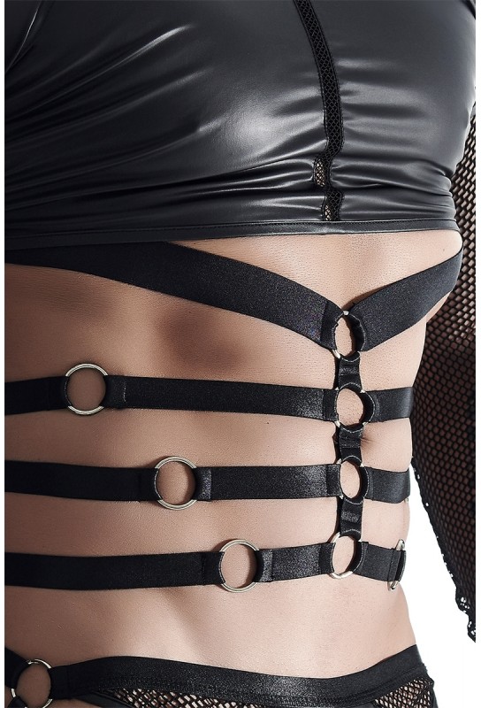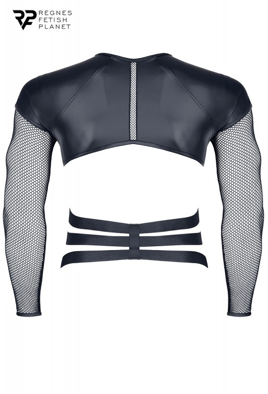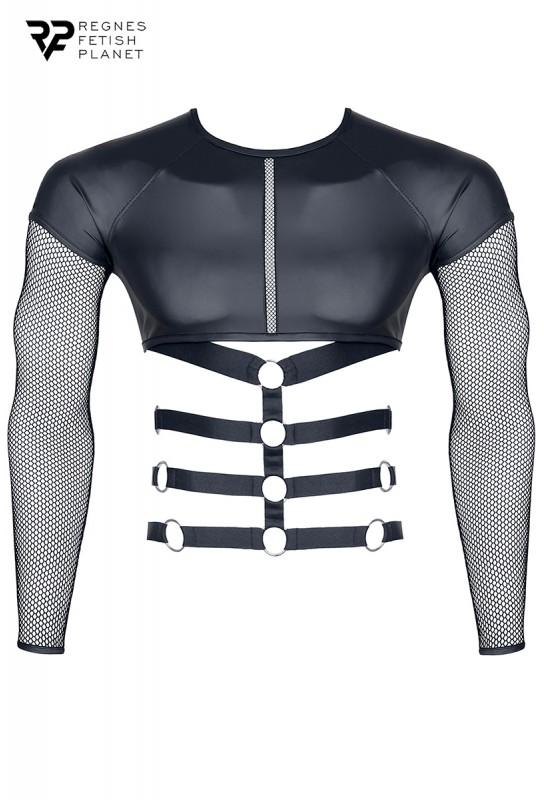 BDSM-pleasure est bienheureux de vous présenter, ce beau T-shirt noir à manches longues harnais Wetlook de la marque Regnes Fetish. Le T-shirt est en maille dont le bas est fait tel un harnais pour vous donner une belle posture et vous redonner confiance.